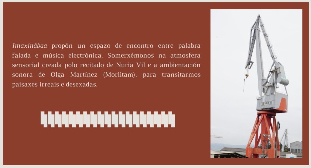 This project proposes a space that combines the spoken word and the electronic/experimental music. We immerse ourselves here, into an atmosphere created for the senses with the poems of Nuria Vil and the sound of MorlitaM ( Olga Martínez). Let’s create unreal landscapes!